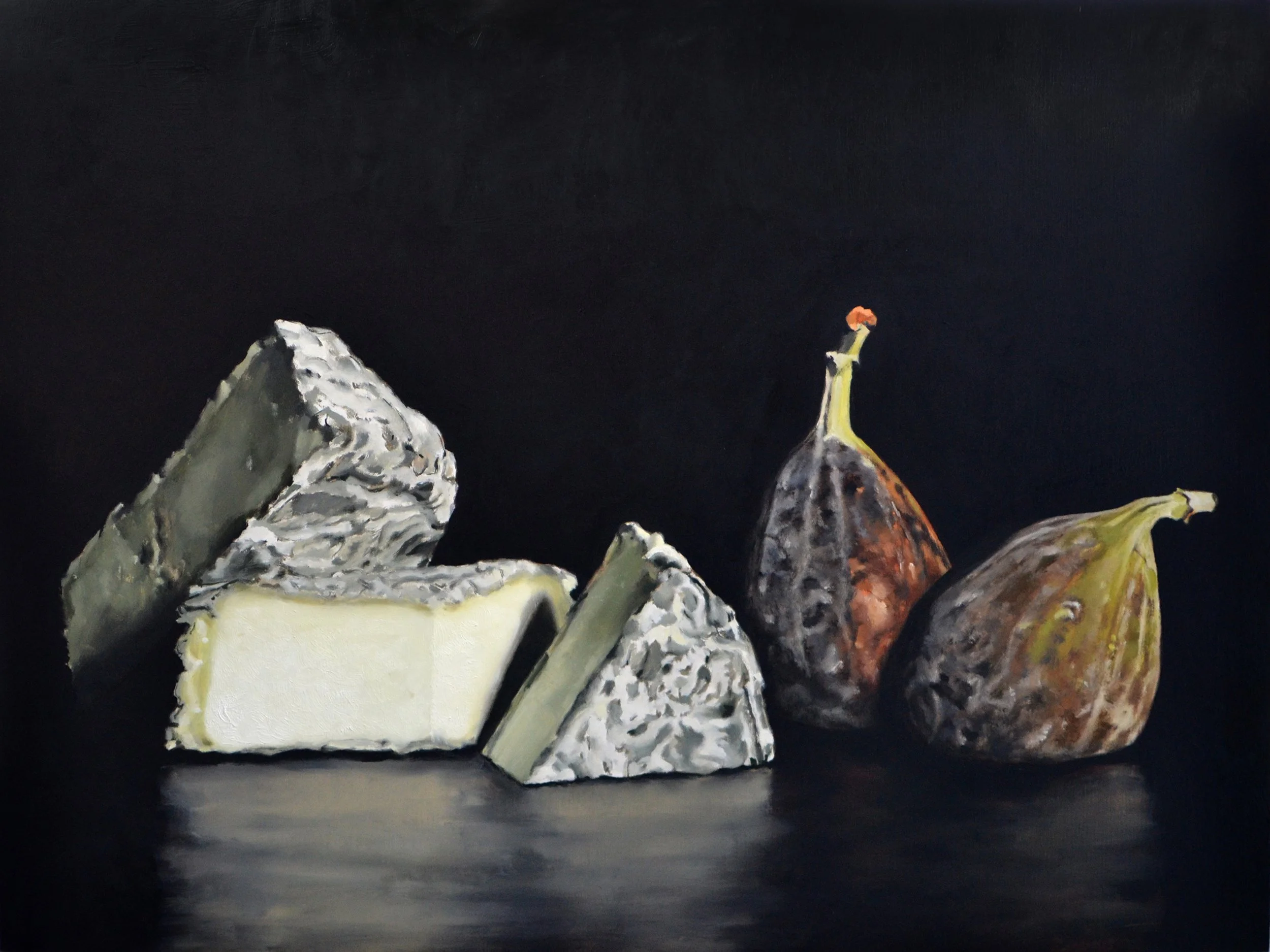 two figs with chèvre, 2023, oil on wood panel, 46 x 61cm / 18 x 24 inches.